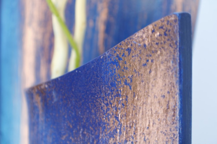 Can you feel the temperature and the movement of the water in this abstract mixed-media painting? This wood “canvas” is rich in texture and presents a variety of blue and green hues, alongside the silvery metal and the shine of broken glass.