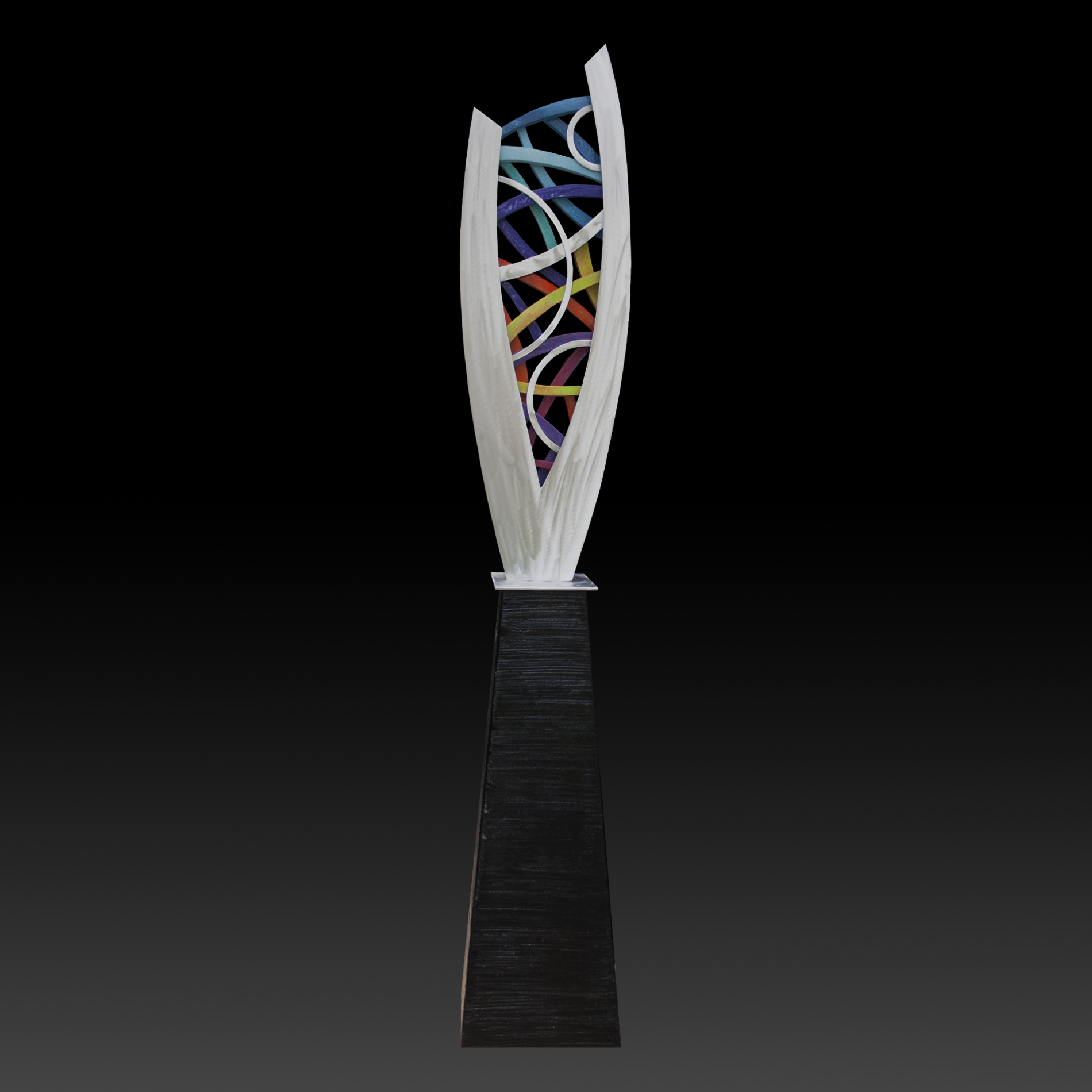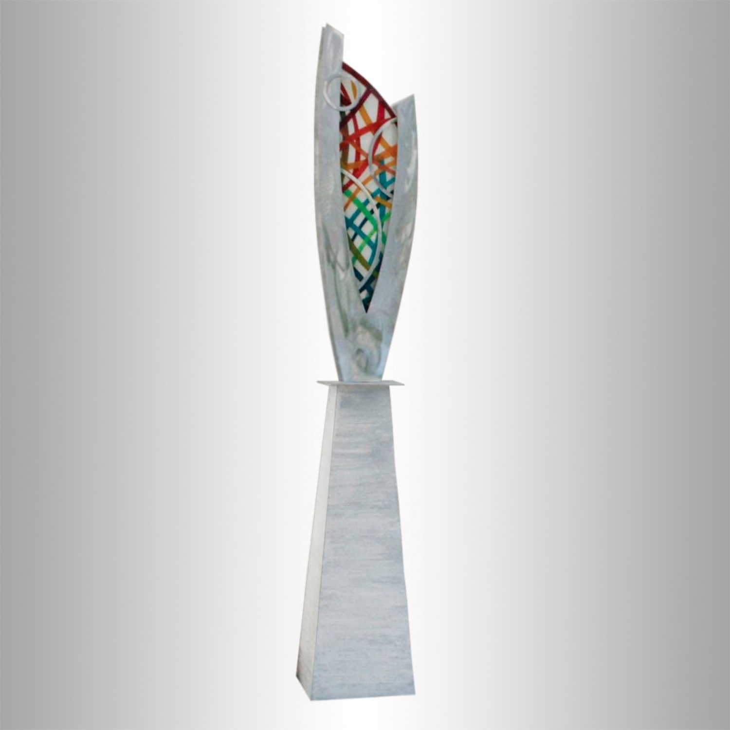 Don’t you like the flow, movement and contrast of this piece? The blue/turquoise shade in this glass seems to change during the day as the light around it changes. The patterns on the aluminium also seem to move along with you as you walk by. This is a simple, clean-designed, ever-adapting piece of artwork.