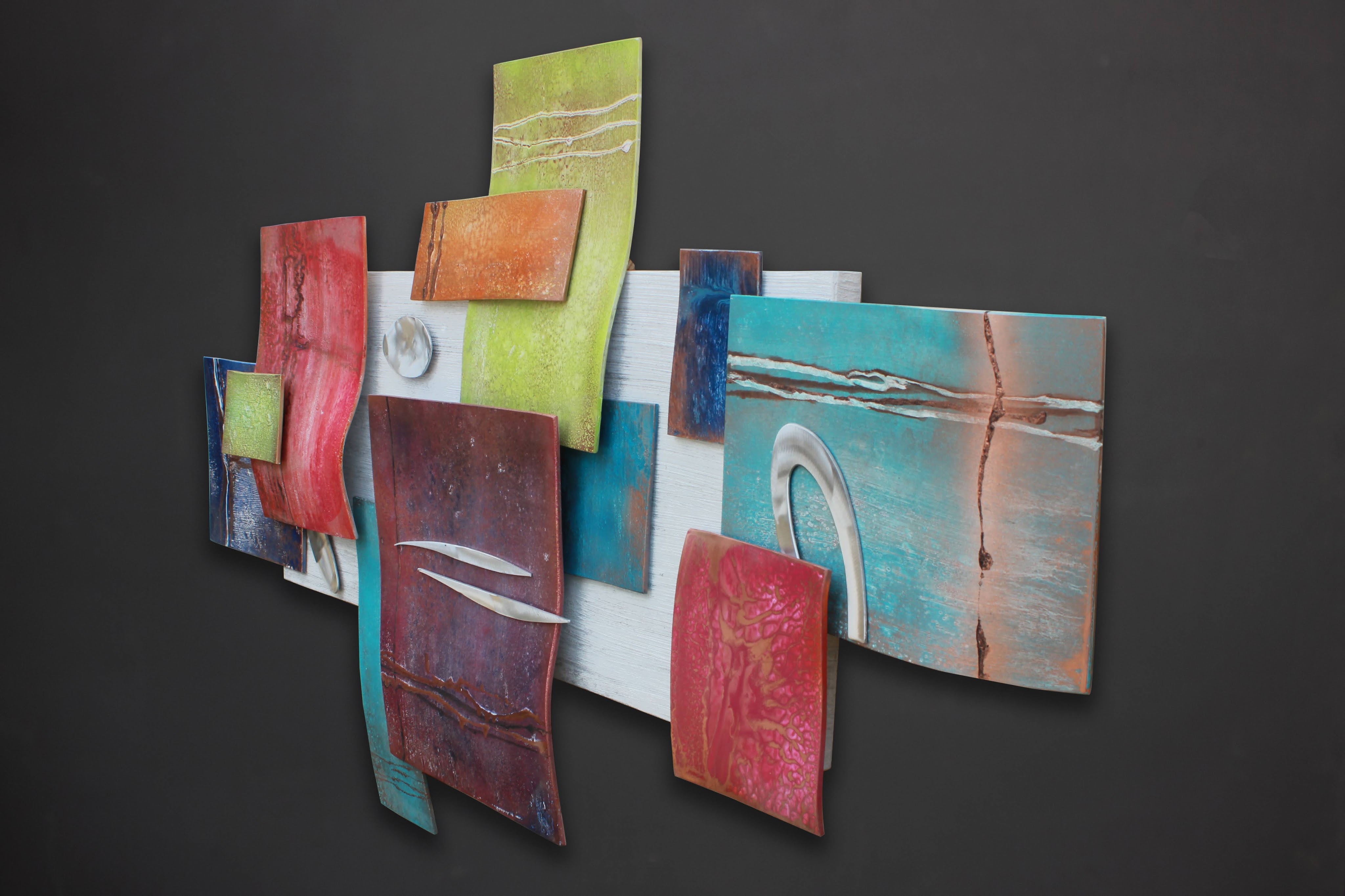 A set of different small paintings, created with different textures, out of plastics, polymers and aluminium. This is a tridimensional piece. The original was created with an 8-ft wide and (almost) 4-feet tall dimension, and a depth of about 4 inches, and seems to float on the wall.